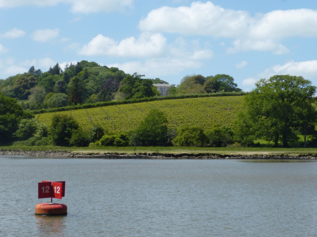 Earlier in the month I posted about the locations which had inspired me to create the coastal community of Kingswater – a town of two halves facing each other across the estuary of the fictitious Kings River. Fowey in Cornwall is the main setting, with a few additions from the town of Dartmouth in Devon. The backdrop to a story is important, but another essential part of this parallel universe is what lies within that setting. In Shadows on the Water, Heron’s Gate House and Vineyard played an important role. The inspiration for this came about on a river trip up to Totnes (used for the fictional town Kingshead in the novels) where I spotted what we were told by the tour boat manager was the Sharpham Trust’s Sandridge Barton Vineyards. A new state of the art winery has been built there and a future visitor centre is planned. The vines which sprawl over the hillside towards the banks of the River Dart, produce award winning wines and on September 9th this year the winery will be celebrating its fortieth anniversary. You can read more about the business, their history and the wines and cheese they produce by clicking on the blue and white Sharpham WordPress logo below.